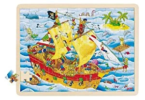 Houten legpuzzel met thema “Piraten”. De afbeelding bestaat uit 96 stukjes.