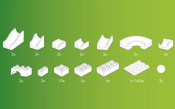 Deze doos bevat een selectie van alle baanelementen en bouwstenen, die nodig zijn voor het bouwen van een eerste eigen miniknikkerbaan.