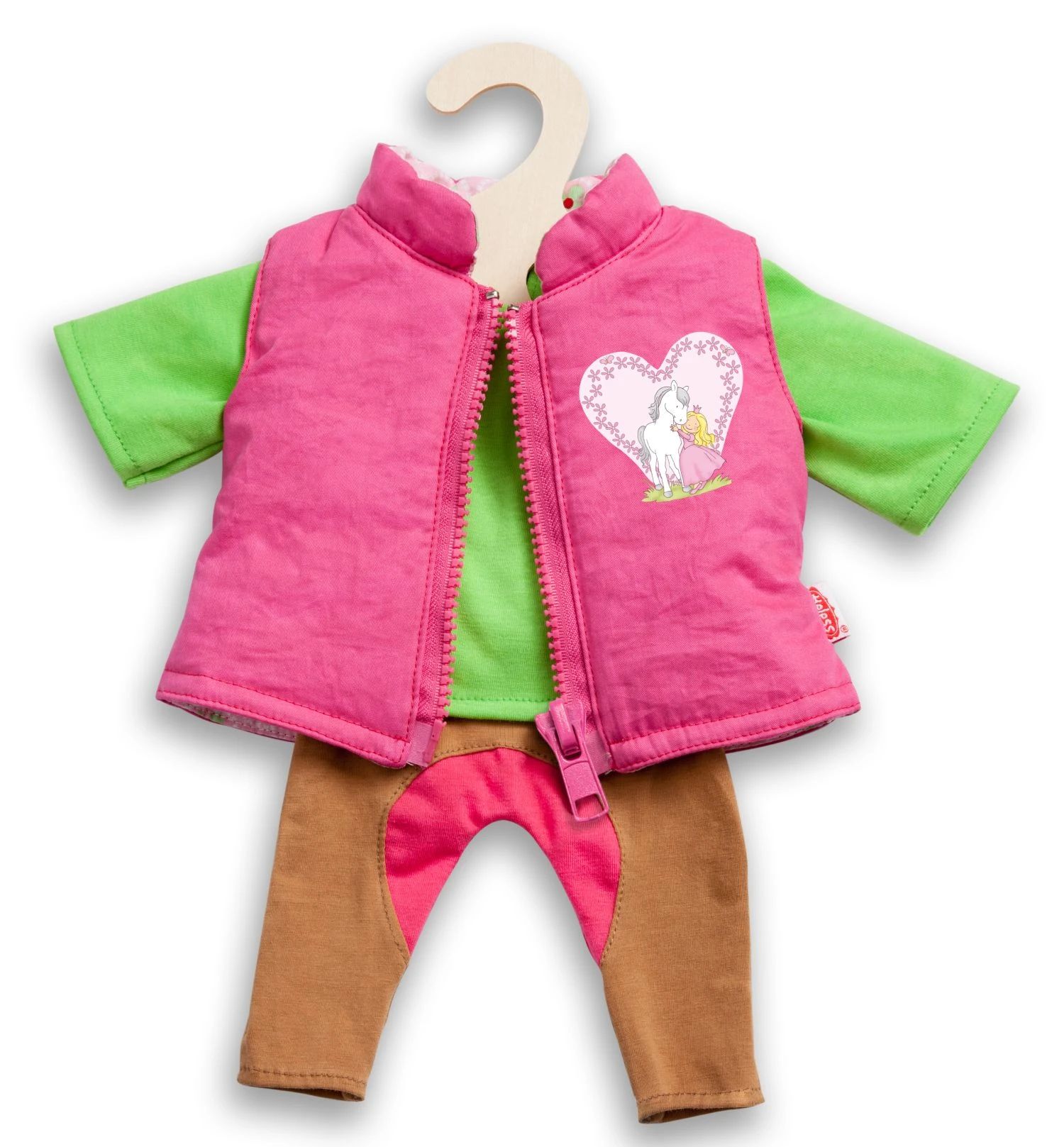 De set bestaat uit een rijdbroek, een t-shirt en een bodywarmer. De bodywarmer kan 2-zijdig gedragen worden.