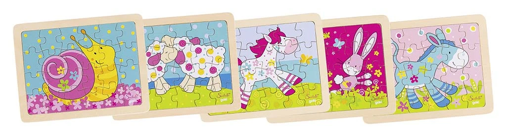 Set van 5 verschillende houten puzzels met steeds 24 stukjes.