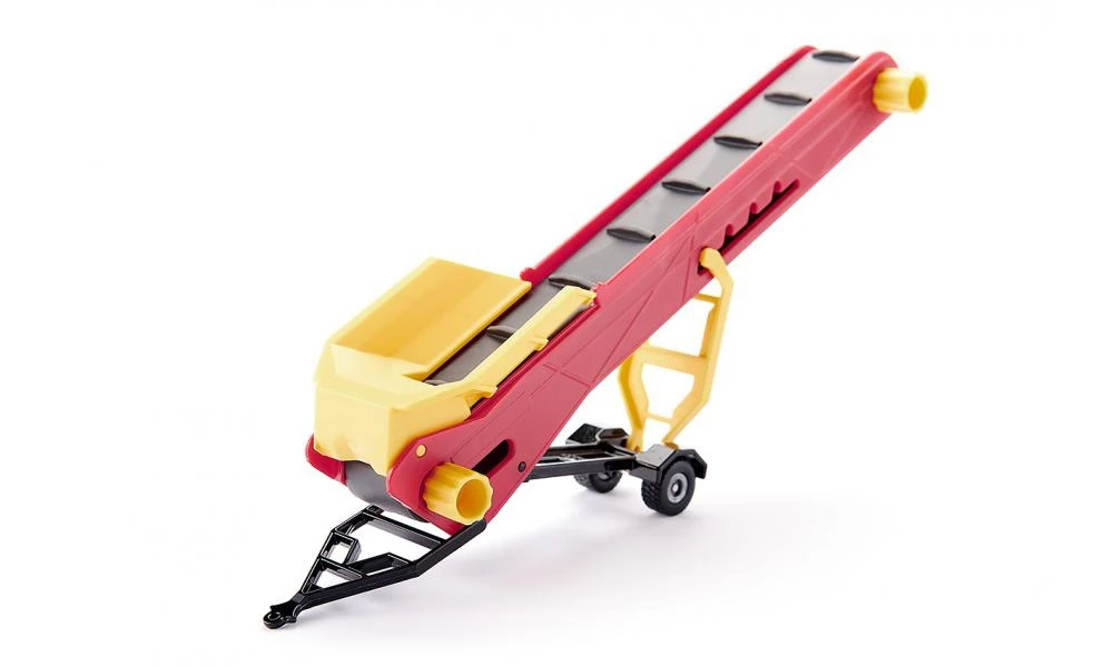 De Massey Ferguson tractor met frontlader en de enorme schop is op zich al een indrukwekkende verschijning. De hoogte van de frontlader en de kantelhoek van de schop kunnen worden versteld. Aan de aanhangerkoppeling hangt een grote transportband met een dissel. Professionele vervoerders kunnen de goederen vervoeren met behulp van de hoogteverstelling en de mechanische draai-aandrijving.