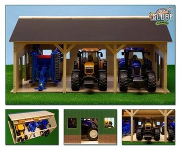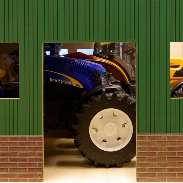 In deze tractor loods passen 3 voertuigen met een schaal van 1:16, zoals alle Bruder tractoren.