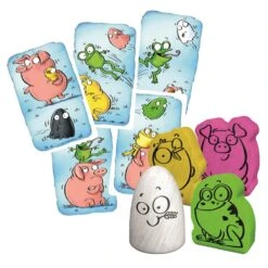 Bliksemsnel reactiespel voor jonge kinderen. Draai steeds de bovenste kaart om en grijp zo snel mogelijk de voorwerpen die op de kaart in de juiste kleur zijn afgebeeld. De snelste spelers winnen een kaart. Wie wint er de meeste? Met uitdagende variant voor iets oudere kinderen!